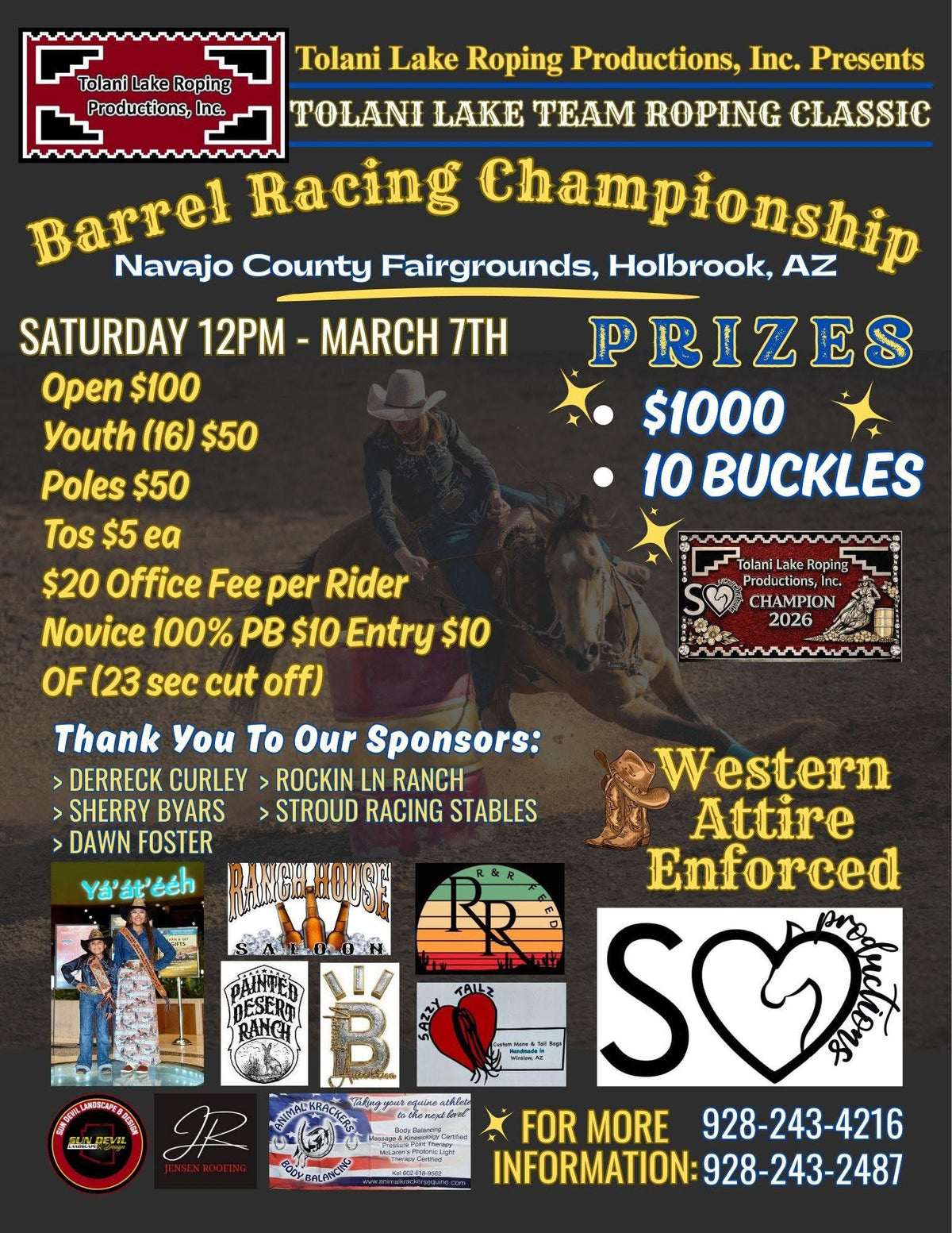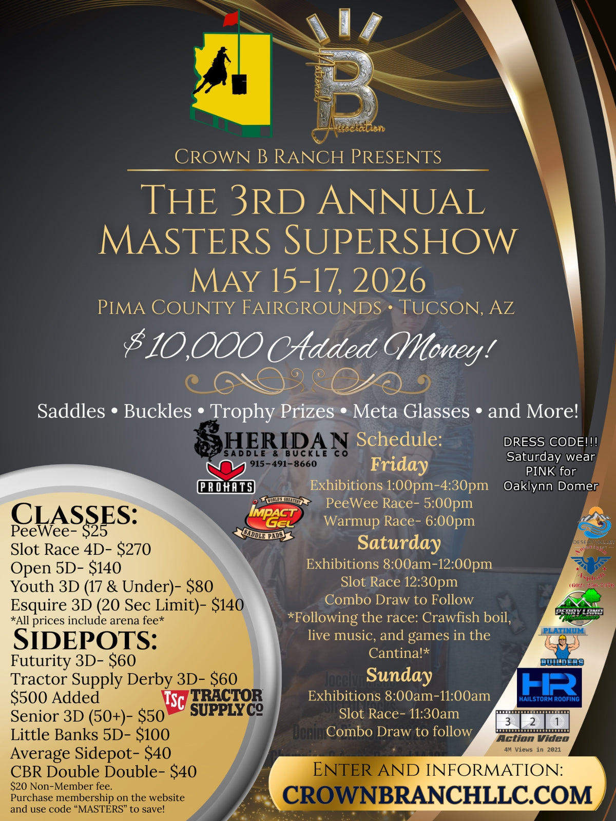 Our shows are only as great as our sponsors behind us who generously support not only our productions but the industry as a whole. Please support these great companies Greenworks Tools, Tractor Supply Benson, Az, Catrillo Law Firm, White Stallion, Wellness on the ranch, Peak Performance Recovery, Crooked J Silver, & Creations in Thread.