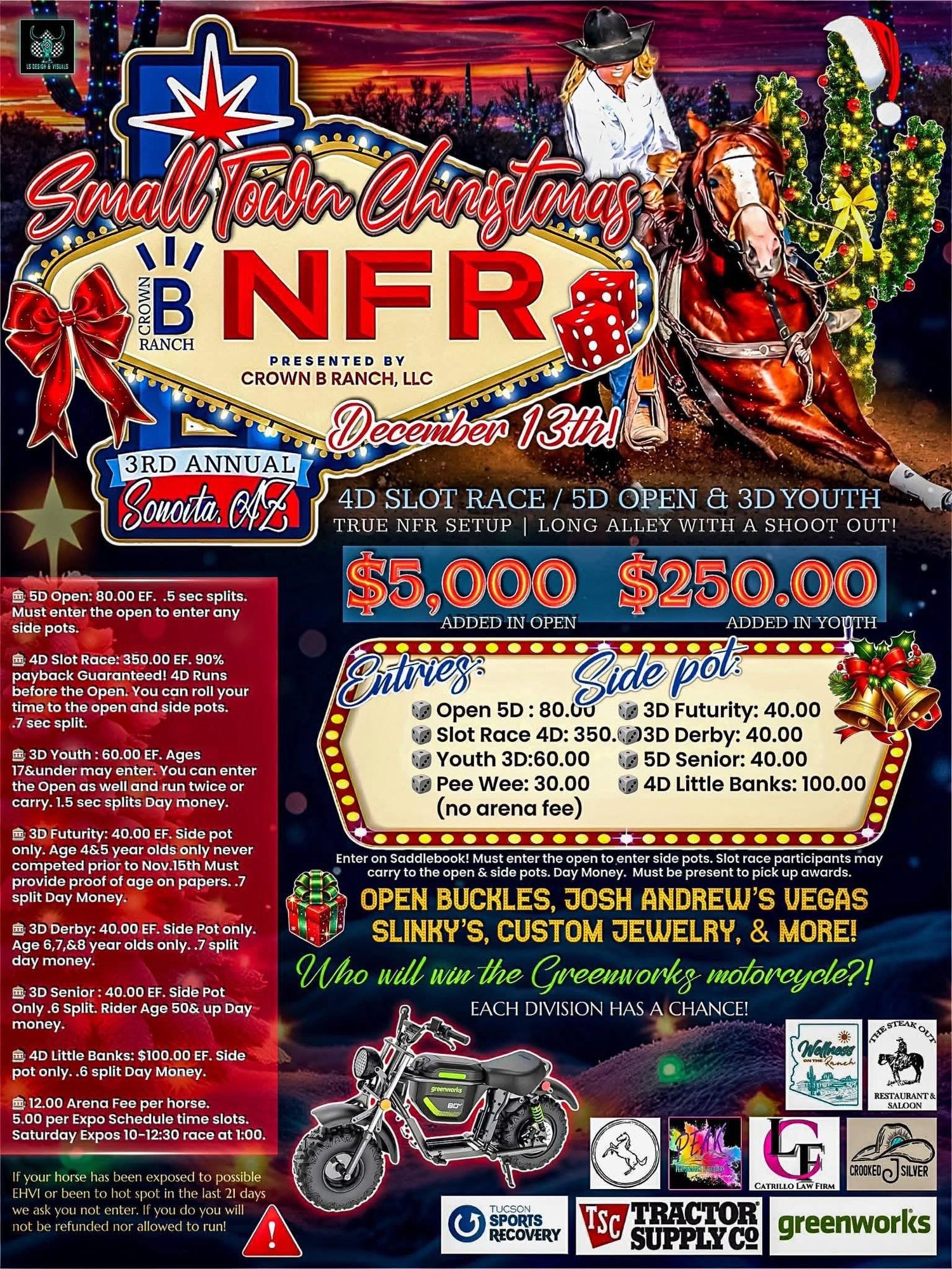 https://saddlebook.com/events/124974D Slot Race / 5D Open & 3D YouthPAID OUT OVER 130k in 2025 so far!NFR IN SONOITADecember 13th Small Town ChristmasSonoita, AZ️TRUE NFR SETUP LONG ALLEY with a shoot out!️5,000 added in the open250.00 in the youthEntries :Open 5D : 80.00Slot Race 4D: 350.00Youth 3D:60.00Pee Wee: 30.00 (no arena fee)Side Pots:3D Futurity: 40.003D Derby: 40.005D Senior: 40.004D Little Banks: 100.00Rules:Enter on SaddlebookMust enter the open to enter side pots. Slot race participants may carry to the open & side pots. Day Money. Must be present to pick up awards. Who will win the Greenworks Motorcycle? Top 2 in each D and last crying hole of each D will get their name in the drawing. 15 barrel racers will have a chance to pull out with their new Motorcycle! One winner 15 chances.5D Open: 80.00 EF. .5 sec splits. Must enter the open to enter any side pots.4D Slot Race: 350.00 EF. 90% payback Guaranteed 4D.Runs before the Open. You can roll your time to the open and side pots. .7 sec split3D Youth : 60.00 EF. Ages 17&under may enter. You can enter the Open as well and run twice or carry. 1.5 sec splits Day money,3D Futurity: 40.00 EF. Side pot only. Age 4&5 year olds only never competed prior to Nov.15th Must provide proof of age on papers. .7 split Day Money3D Derby: 40.00 EF. Side Pot only. Age 6,7,&8 year olds only. .7 split3D Senior : 40.00 EF. Side Pot Only .6 Split. Rider Age 50& up Day money.4D Little Banks: $100.00 EF. Side pot only. .6 splits Day Money.12.00 Arena Fee per horse.5.00 per Expo Schedule time slots RESERVATIONS ONLYSaturday Expos 10-12:30 Opening Ceremony 12:50 Slot Race at 1:00, Open combo to followSchedule: Opening Ceremony @ 12:50 immediately after Slot Race, Big Drag, Open Combo Draw to Follow , Pee Wee immediately following last runner in open. Awards and money after Pee Wee.MUST BE PRESENT FOR PRIZES!!!!!!!! No exceptions.DRESS CODE for Slot Race ONLY wear your best Vegas costume! Award for Best Dressed!️Open Buckles, Jumbo Checks, Josh Andrews Vegas Slinkys, Heated Vest, Custom Silver & Turquoise Jewlery, Jackets & so much more!*If you’d like to make private payments to avoid Saddlebook fees send us a message. Look